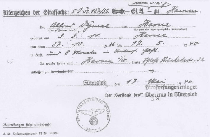 Nach Angaben von Rolf Dymel mussten auch folgende Herner Bürger, die im Prozess gegen Alfred Dymel und andere verurteilt worden waren, im Zuchthaus Herford ihre Strafen verbüßen: Robert Brauner, Alfred Kürbitz, Paul Völkel, Josef Wallbraun, Christian Winter und Karl Wolmeyer. Obwohl das geplante Strafende für Alfred Dymel auf den 17. August 1940 festgelegt worden war, wurde er bereits ein Vierteljahr früher, am 17. Mai 1940, aus der Haft im Strafgefangenenlager Oberems bei Gütersloh entlassen, wie auch sein Entlassungsschein belegt. Obwohl auch er wegen seiner Zuchthausstrafe von den Nationalsozialisten zunächst als „wehrunwürdig” eingestuft worden war, wurde er im Verlaufe des Krieges zum Bewährungsbataillon 999 eingezogen. Rolf Dymel berichtet: