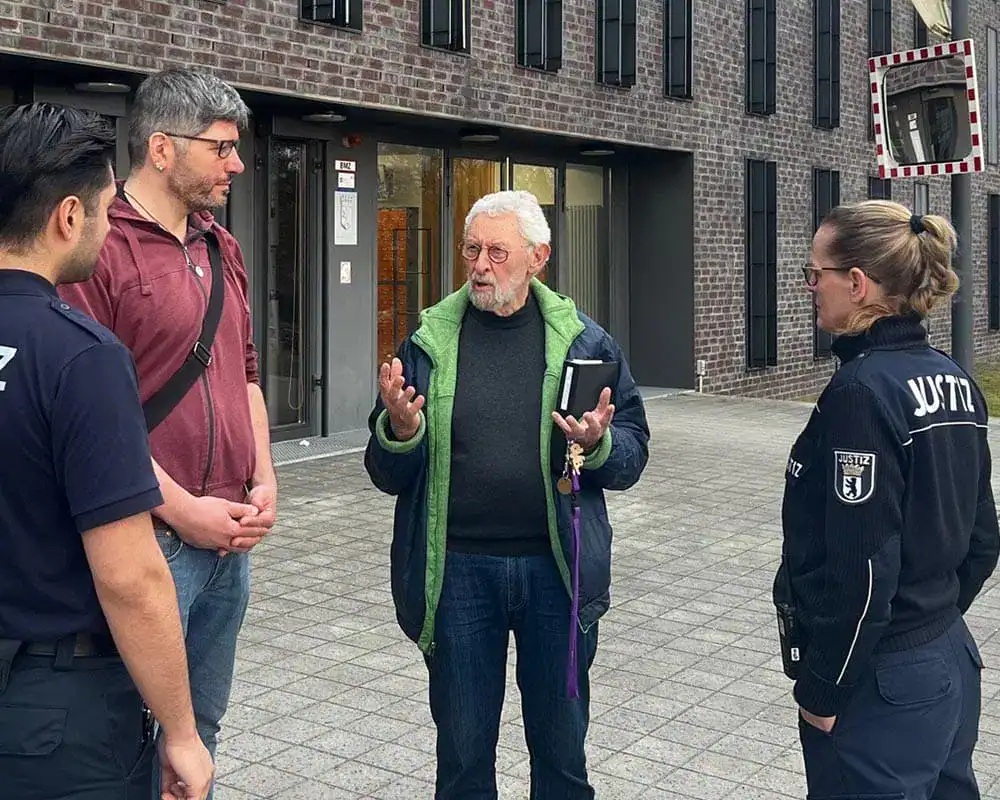 Manfred Lösch mit Diakon Jonas Kessler und zwei Justizbediensteten. Foto: Lösch