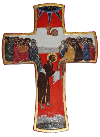 Die Reaktion, die Petrus zeigt, scheint zu sagen, „Du spinnst wohl!“ Wenn wir genauer hinschauen, zeigt er aber auf seine Füße und seinen Kopf. Er sagt zu Jesus: „Dann nicht nur die Füße, sondern auch das Haupt.“ Aber die andere Aussage hat vielleicht ein bisschen Berechtigung, weil er ja sagt: ´Niemals sollst du mir die Füße waschen!´ Er kann nicht verstehen, dass Jesus das machen will. Aber wir sehen: Jesus macht das mit Hingabe. Aus Hingabe. Und da sind wir beim Kreuz. Es ist ja kein klassisches Kreuz. Mit dem toten Körper Jesu. Aber die ganze Hingabe ist schon dabei. Sein Leib und sein Blut, die er hingibt in den Gestalten von Brot und Wein. Seine Liebe, die über alle Grenzen hinweggeht, wie in der Fußwaschung deutlich wird. Und unten trifft er sogar auf den Tod in seiner Hingabe. Der Schädel, der unten abgebildet ist, stellt Adam dar, durch den der Tod in die Welt kam. Er kommt in Berührung mit Jesu Blut, mit Jesu Liebe, der sich hingibt und so wird sogar der Tod überwunden. Diese Liebe, diese Hingabe ist stärker als der Tod. Jesus blickt uns also an. Schenkt uns Ansehen. Blickt uns in seiner Liebe an. Und die Jünger werden nach der Fußwaschung aufgefordert diese Liebe ebenso zu leben und weiterzugeben. ´Ich habe euch ein Beispiel gegeben, damit auch ihr so handelt, wie ich an euch gehandelt habe.´