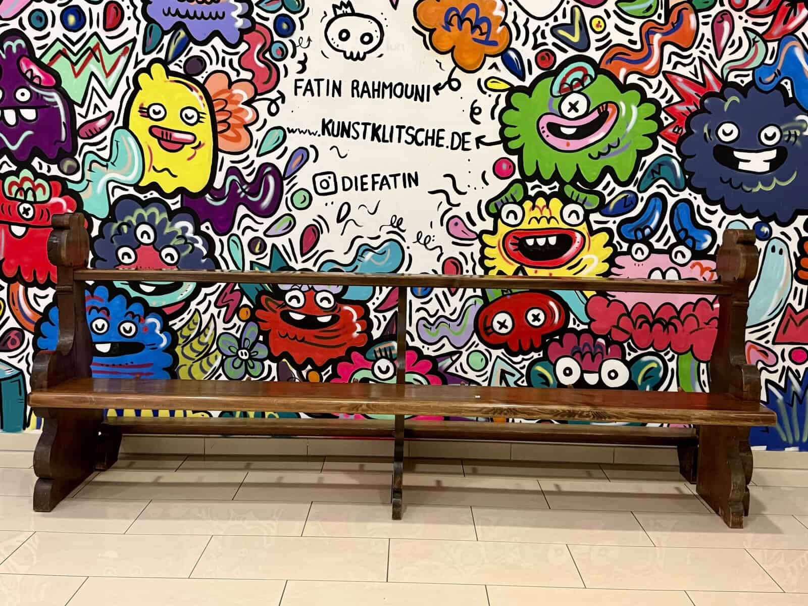 Die am Bodensee ansässige Streetart-Künstlerin Fatin Rahmouni (*1983) arbeitet seit mehreren Jahren mit ihren Monstern zusammen. Ursprünglich als Grafikdesignerin tätig, nutzt sie ihre erlernten Fähigkeiten in Konzept und Komposition, um eine neue Welt unterschiedlichster Emotionen zu erschaffen, die sich in ihren Bildern widerspiegelt. Gefühlt stört die Kirchenbank dieses Kunstwerk. Ein krasser Gegensatz zur bunten monsterhaften Welt. Der Weg zu den Toiletten führt direkt an dieser Kirchenbank vorbei. Sie steht einfach da, ohne Beschreibung und ohne Hinweisschild.