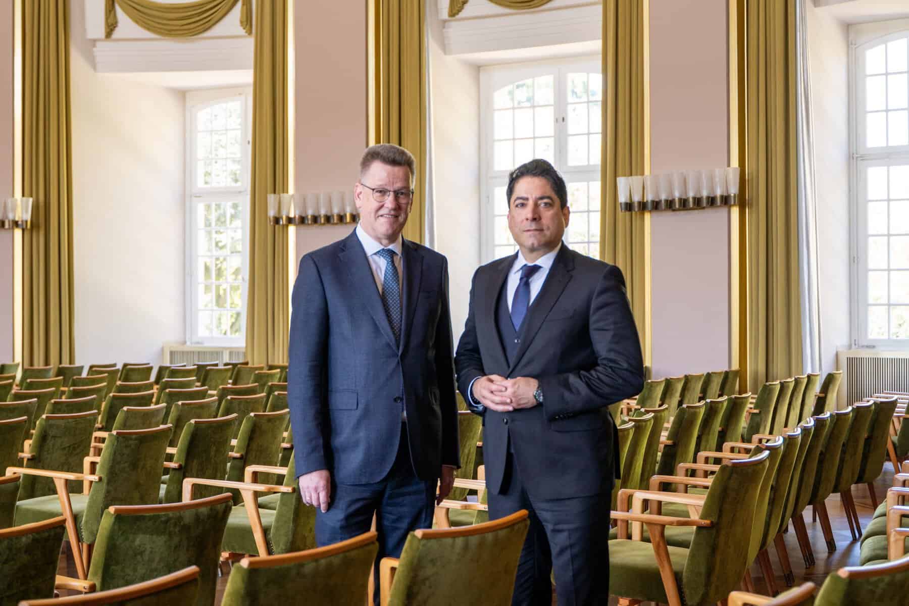 Rektor Prof. Dr. Johannes Wessels (links) und Gründungsdekan Prof. Dr. Mouhanad Khorchide informieren über die Gründung der ersten deutschen „Islamisch-Theologischen Fakultät“ an der Universität Münster. Fotos: Linus Peikenkamp