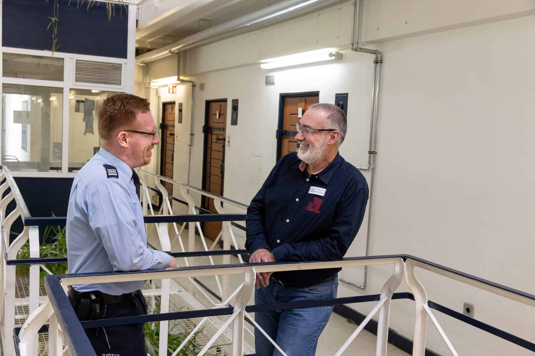 Gespräch des Gefängnisseelsorgers Klaus Schütz mit einem Bediensteten der JVA Essen.