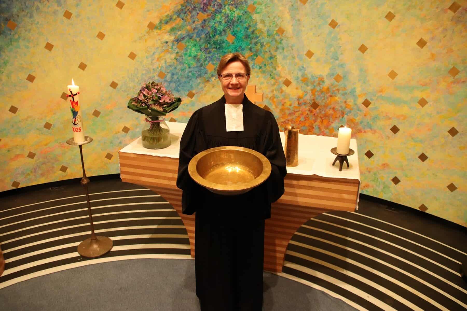 Gefängnisseelsorgerin Susanne Schart gestaltet im Knast-Gottesdienst eine Taufe. Da die anstaltseigene Frauenkirche bisher keinen eigenen Taufstein besitzt, hat die Evangelische Kirchengemeinde Gelsenkirchen-Nord kurzerhand mit der Taufschale ausgeholfen.