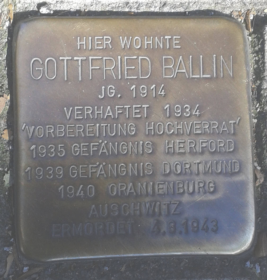 „Der Vater des Angeklagten (Gottfried Ballin; A.B.) war Arzt. Kurz nach dem Kriege ist er an den Folgen einer Kriegsverletzung verstorben. Ballin bestand im März 1933 das Abitur und trat dann in eine Buchhandlung als Lehrling ein. Im Jahre 1930 war er Mitglied der Reichsarbeitsgemeinschaft der Kinderfreunde, einer Untergliederung der SPD geworden. Daraus trat er jedoch schon 1 Jahr später aus, um sich der neu gegründeten SAP (Sozialistische Arbeiterpartei Deutschlands; A.B.) anzuschließen. Von Sommer 1932 ab will er sich zunächst jeglicher politischen Tätigkeit enthalten haben.