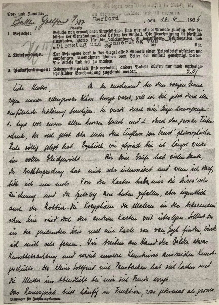 Der Brief von Gottfried Ballin vom 10.4.1936 aus dem Zuchthaus Herford gibt im oberen Teil obligatorische Hinweise für Besuche des Häftlings, für seinen Briefverkehr und für den Erhalt von Paketsendungen; außerdem weist er am unteren Rand darauf hin, dass es sich um einen „Briefbogen für Zuchthausgefangene” handelt. Quelle: Brigitte und Fritz Bilz: Diesen Menschen hat man mir totgeschlagen. Briefe aus Gestapohaft und KZ, Köln 1999, S. 108