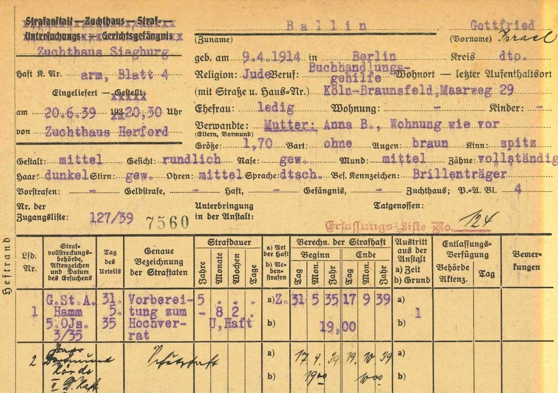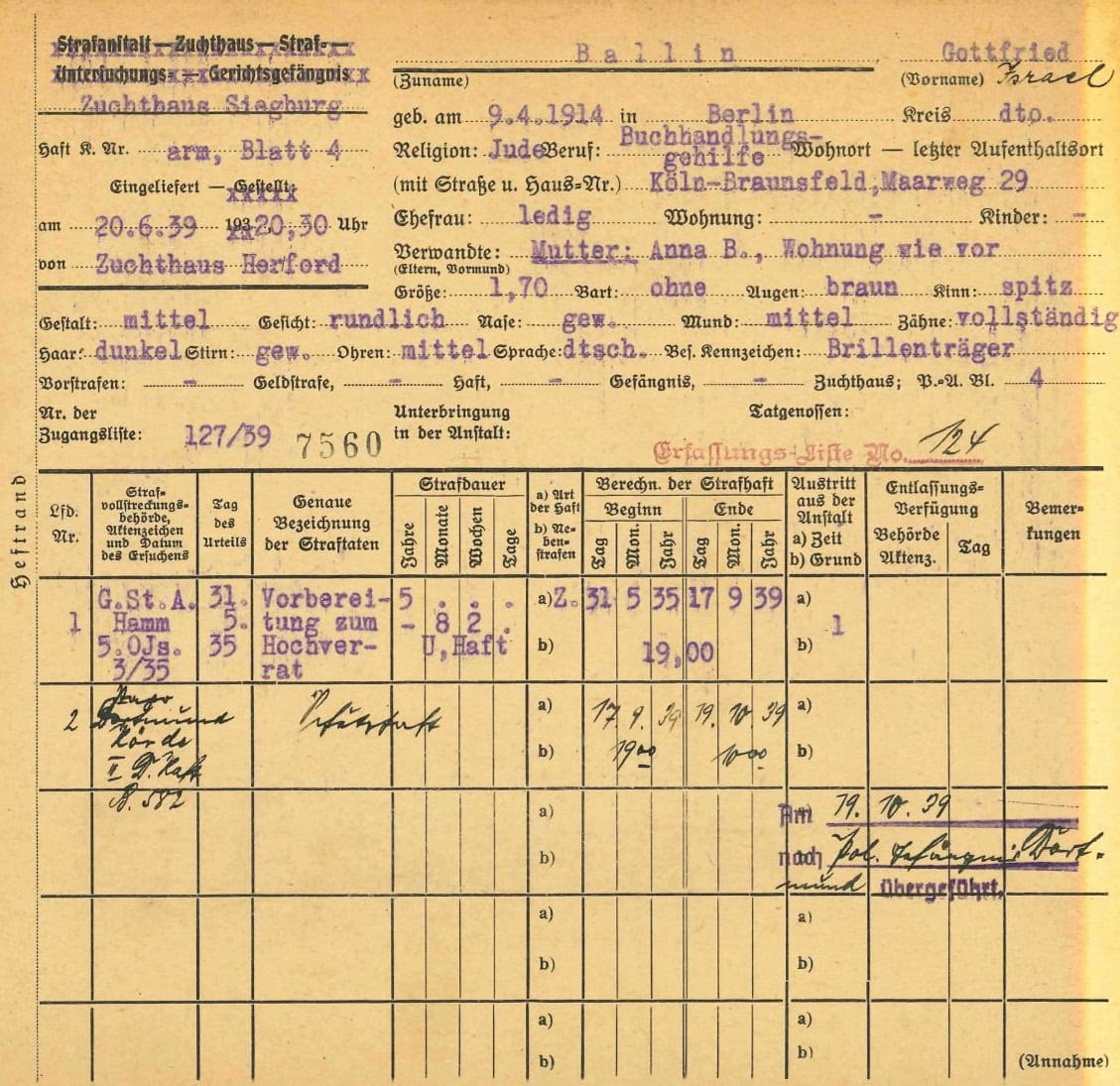Die Häftlingskarteikarte des Zuchthauses Siegburg für Gottfried „Israel” Ballin dokumentiert unter anderem, dass Ballin vom Zuchthaus Herford kommend am 20.6.1939 um 20.30 Uhr in das Zuchthaus Siegburg eingeliefert wurde. Quelle: Landesarchiv NRW Abteilung Rheinland, Duisburg: äftlingskarteikarte des Zuchthauses Siegburg für Gottfried Ballin (Signatur: GR_0349_1_Ballin.pdf)