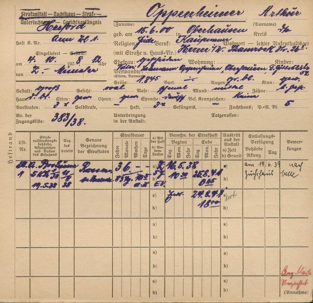 Die Höhe der Strafhaft und der Untersuchungshaft wird auch aus der Häftlingskarteikarte des Zuchthauses Herford ersichtlich. Dieser Karte zufolge hatte das Landgericht Bochum Oppenheimer wegen „Rassenschande” zu einer Zuchthausstrafe von drei Jahren und sechs Monaten (unter Anrechnung von 83 Tagen, 10 Stunden und fünf Minuten Untersuchungshaft) und zu fünf Jahren Ehrverlust verurteilt. Als Strafbeginn wurde nicht der 11. Mai 1938, also der Tag der Urteilsverkündung, sondern erst der 16. Mai 1938 und als geplantes Strafende der 25. August 1941 bestimmt. Auf der Häftlingskarteikarte war der Tag des Urteils allerdings fälschlicherweise mit dem 11. August 1938 angegeben worden. Vom Polizeigefängnis in Bochum aus wurde Oppenheimer zunächst zum Zuchthaus Münster überführt, was durch einen Eintrag in eine „Nachweisung über Unterbringung und Beschäftigung oder Nichtbeschäftigung (Arbeitsmangel, Arrest, Krankheiten usw.)” belegt ist.