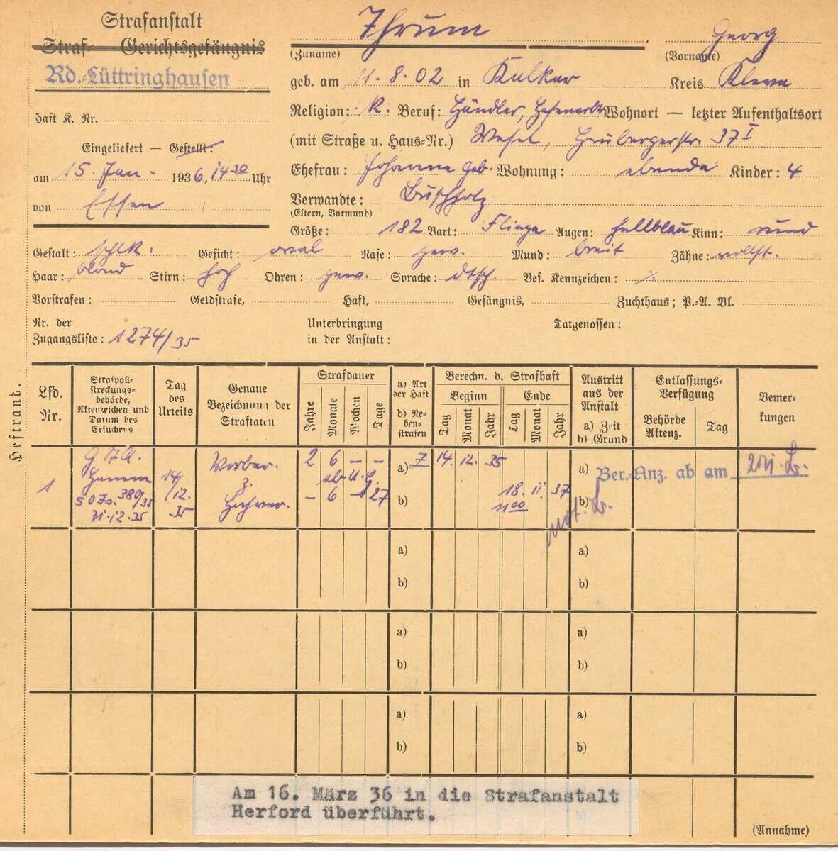 Georg Thrum wurde wegen Vorbereitung zum Hochverrat zu einer Zuchthausstrafe von zwei Jahren und sechs Monaten (unter Anrechnung von sechs Monaten und 27 Tagen Untersuchungshaft) verurteilt; sein geplantes Strafende wurde auf den 18. November 1937 festgelegt. Vom Gerichtsgefängnis Essen kommend, wurde er am 15. Januar 1936 zunächst in das Zuchthaus Lüttringhausen eingeliefert. Bereits zwei Monate später, am 16. März 1936, wurde er von dort (zusammen mit weiteren politischen und nicht politischen Lüttringhausen-Häftlingen wie zum Beispiel Sebastian Bernard, Anton Dal Mas, Josef Michalski, Johann Ratajczak, Alois Thiemel und Antonio T.) zum Zuchthaus Herford überführt. Georg Thrum, der nach dem Zweiten Weltkrieg zunächst als Händler und später als Schausteller tätig war, starb am 29. Juli 1973 in Wesel. Abschließend sei noch auf drei weitere politische Häftlinge im Zuchthaus Herford hingewiesen, die im Widerstand gegen das NS-Regime aktiv waren und der katholischen Kirche angehörten. Es handelt sich hier um Nikolaus Franz, Heinrich Schrynemaekers und Franz Kr., deren Verfolgungsschicksal bereits in den Folgen 6, 18 und 22 der Artikelserie über das Zuchthaus Herford und seine Häftlinge dargestellt wurde, ohne dass in jenen Beiträgen die Religionszugehörigkeit erwähnt wurde.