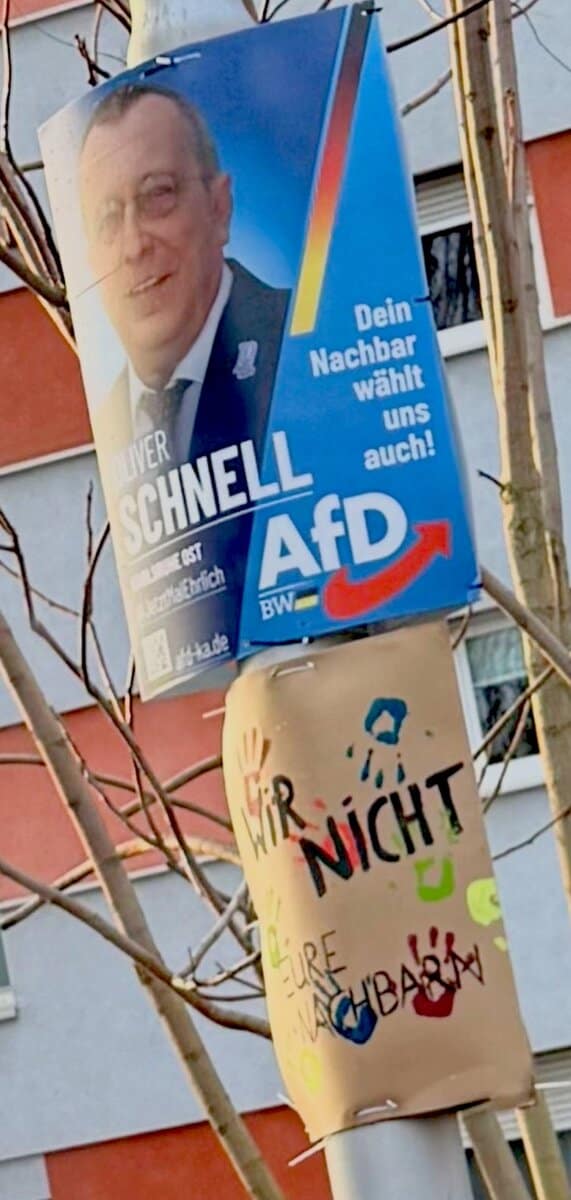 In Karlsruhe-Durlach hingen in den Wochen vor der Landtagswahl in BW unter den „Nachbar“-Plakaten der AfD („Dein Nachbar wählt uns auch“) an vielen Stellen bunte Plakate mit der Aufschrift: Wir nicht. Eure Nachbarn. Das war eine sehr kreative Idee.