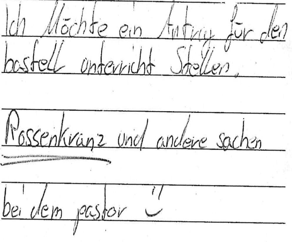Die Erfahrung zeigt, dass es für Anfänger etwa zwei Treffen (je 1 Stunde) zur erfolgreichen Herstellung ihres Rosenkranzes braucht. Meine Aufgabe bestand und besteht darin, die wechselnde Zusammensetzung der Gruppe – in Absprache mit den zuständigen Justizbeamten auf den unterschiedlichen Abteilungen – abzustimmen um einen reibungslosen Ablauf des Treffens zu garantieren. Meine eigene Rolle sah und sehe ich dabei darin: mich selbst auszuprobieren; Erfahrungen zu machen und miteinander zu teilen; ansprechbar für die transzendente Dimension von Gebet, Glaube und Gott zu sein; ergebnisoffen Prozesse wahrzunehmen; Zu- und Vertrauen zu schaffen; An die elementaren Erfahrungen des gemeinsamen „Rosenkranz-Basteln“ füge ich die gemeinsame Suchbewegung an: „Der Rosenkranz im Vollzugsalltag- Möglichkeiten der Bedienung“.