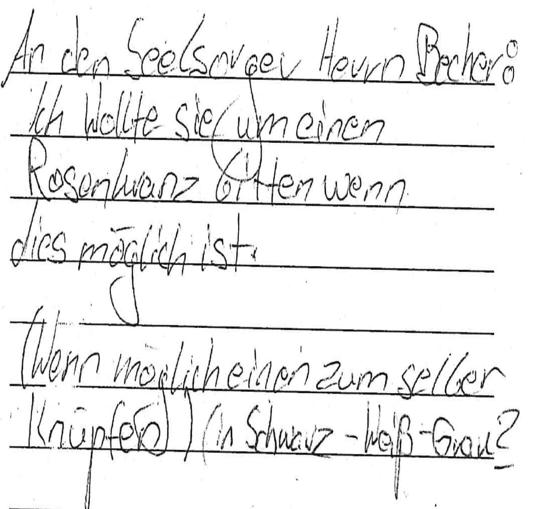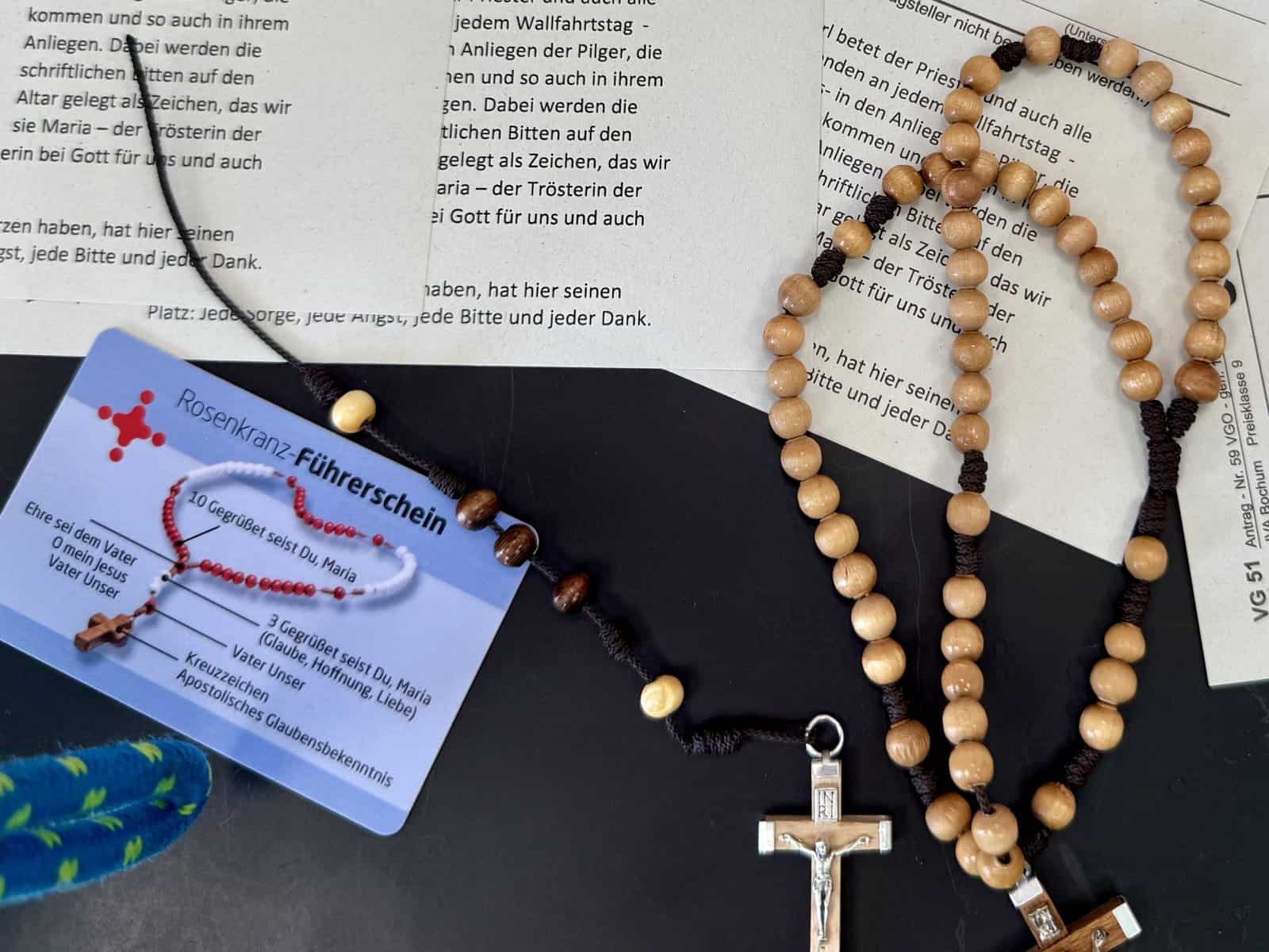 Erst im Jahr 2023 – mit Aufnahme meiner Tätigkeit als Seelsorger im Gefängnis – wurde ich mit Anfragen zum Rosenkranz konfrontiert – und das häufig. Auf meine neugierige Nachfrage: „Warum fragen sie mich nach einem Rosenkranz?“ erhielt ich von einem Inhaftierten eine für mich plausible Antwort: „Wir haben hier ja sonst nix; und der Rosenkranz ist erlaubt!“ Die für mich wahrnehmbare Ausgangssituation bestand und besteht im Wunsch der Inhaftierten: „In der prekären Haftsituation des geschlossenen Vollzuges möchte er etwas zu eigen haben, dass ihm (s)eine spirituelle Dimension – sprichwörtlich – greifbar macht.“
